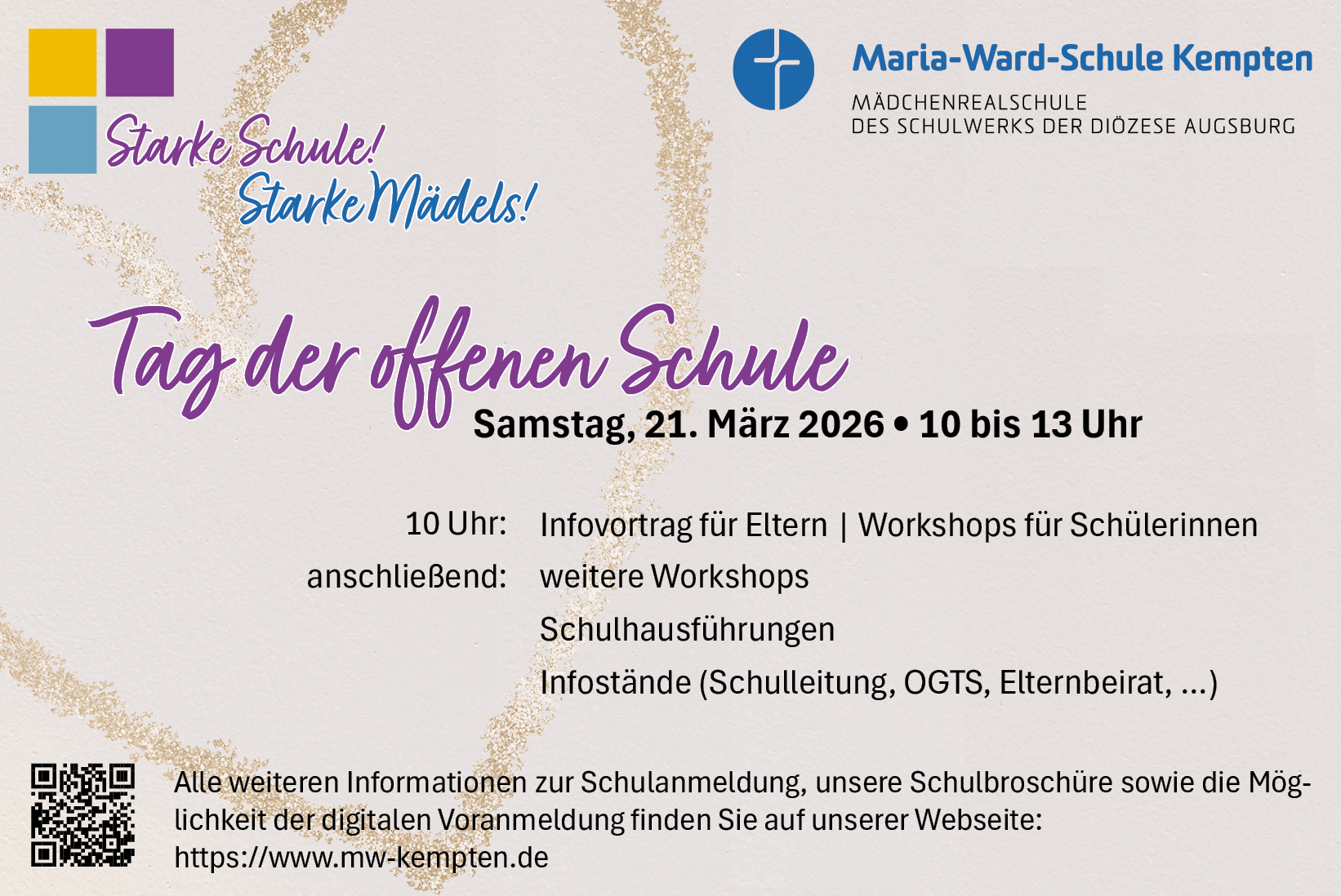 Heute durften wir an unserem Tag der offenen Schule viele interessierte Viertklässlerinnen, Elternund Gäste willkommen heißen – aber auch viele Mädels aus unseren bestehenden Jahrgangsstufen! Unsere Schule war erfüllt von Neugier, Kreativität und ganz viel Teamgeist. In spannenden Workshops konntet ihr einen Einblick in unsere bunte Schulwelt gewinnen. Ein riesiges Dankeschön an unsere Schulleitung, den Elternbeirat, alle Lehrkräfte, Schülerinnen und natürlich an alle Besucherinnen und Besucher – ihr habt diesen Vormittag zu etwas ganz Besonderem gemacht!